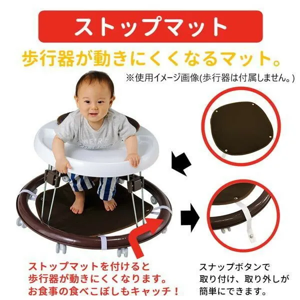 ストップマットを付けると歩行器が動きにくくなります。お食事の食べこぼしもキャッチ!スナップボタンで取り付け、取り外しが簡単にできます。
