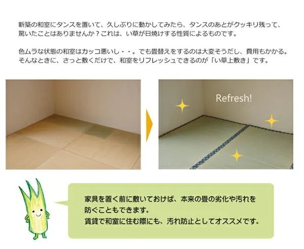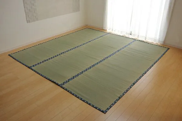 ■商品内容 上敷きを敷くだけで畳のお部屋をリフレッシュ出来ます。日焼けしてしまった畳のリフレッシュに、新品の畳を汚さないためのカバーにご使用下さい。長さ120cm程の国産(九州産)い草を使用しています。そのうち約95cmを使用しています。ヘリ際は多少白みを帯びます。(日焼けではありません、い草の根元と先端部分の色です。)い草は長いものほど高級になります。い草は先端部分が赤茶色く、根元が白く真中が青(緑)色です。真中の良質な青の部分を多く使用するほど、丈夫で綺麗な仕上がりとなります。またイ草は使用するうちに日焼けをしますが、真中の青の部分を多く使用したものほど、全体が綺麗にムラなく日焼けし、味が出ます。国産(九州産)のい草を使用しています。国産い草は一本一本が太く、表皮が厚く繊維がキメ細かいので弾力性があり、耐久性に優れています。い草には空気の清浄化作用、湿度の調節作用があり、汚れにくいといった特徴があります。い草に青森ヒバ加工を施しています。(抗菌、防臭効果)表裏の両面が使えて経済的です。