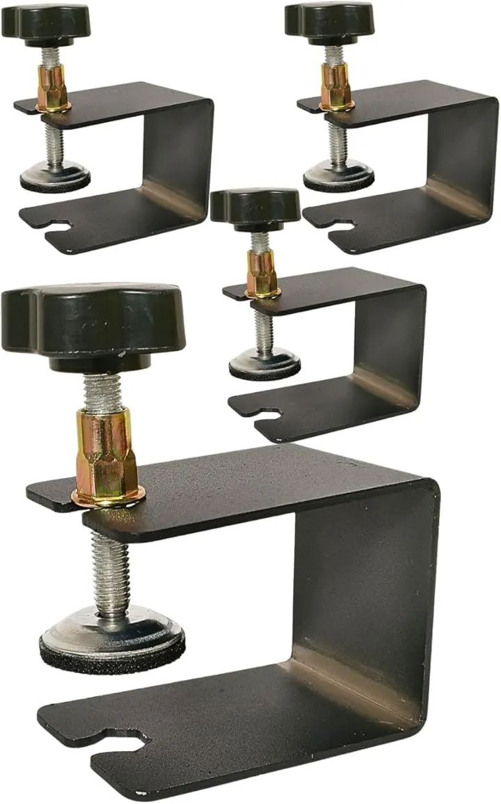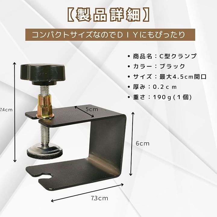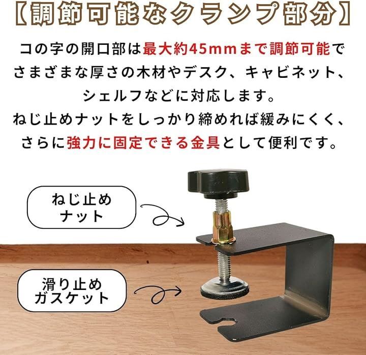 「調節可能なクランプ部分」コの字の開口部は最大約45mmまで調節可能で、さまざまな厚さの木材やデスク、キャビネット、シェルフなどに対応します。