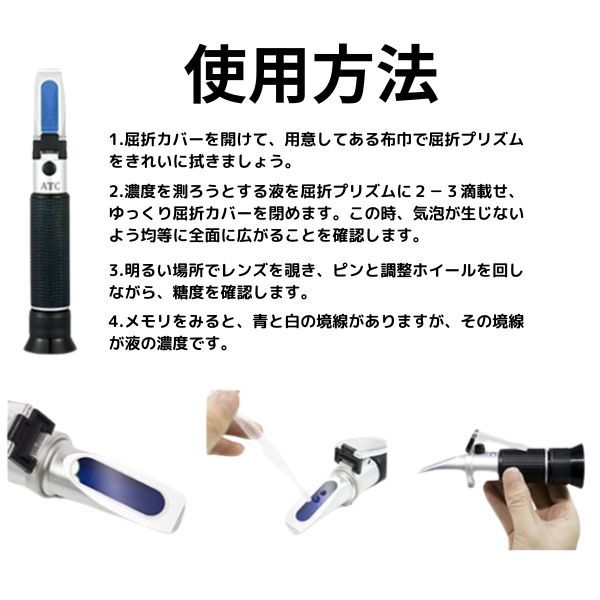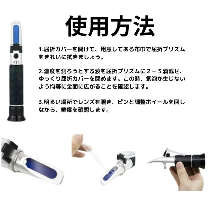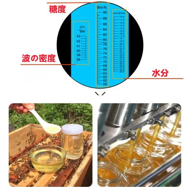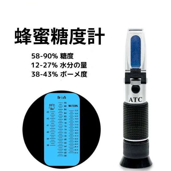 蜂蜜水分と、38~43のボーメ度を光の屈折率を利用して計測できます♪