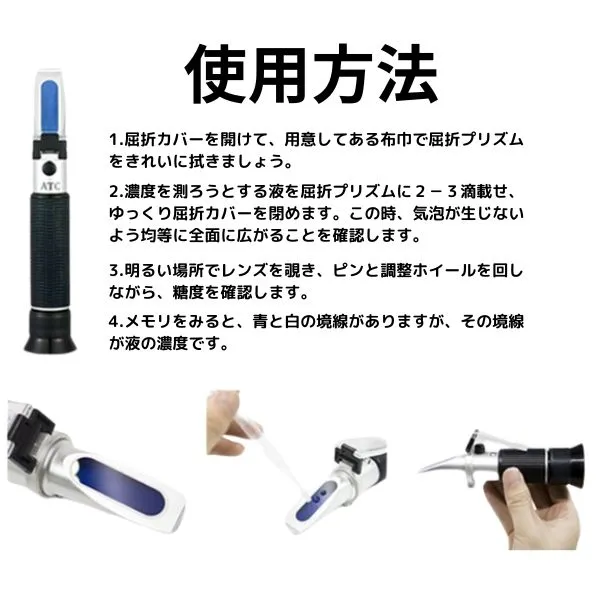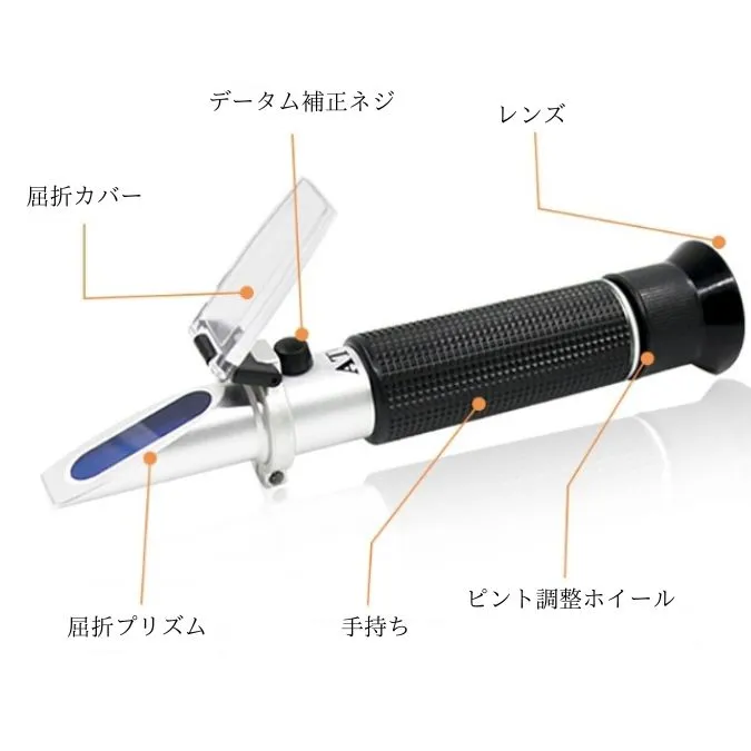 はちみつ、ジャムなどの高糖度計測にも、ご使用出来ます。丈夫なアルミ製の構造で壊れにくく、電池等も必要ありません。いつでもどこでも手軽に測定出来ます。