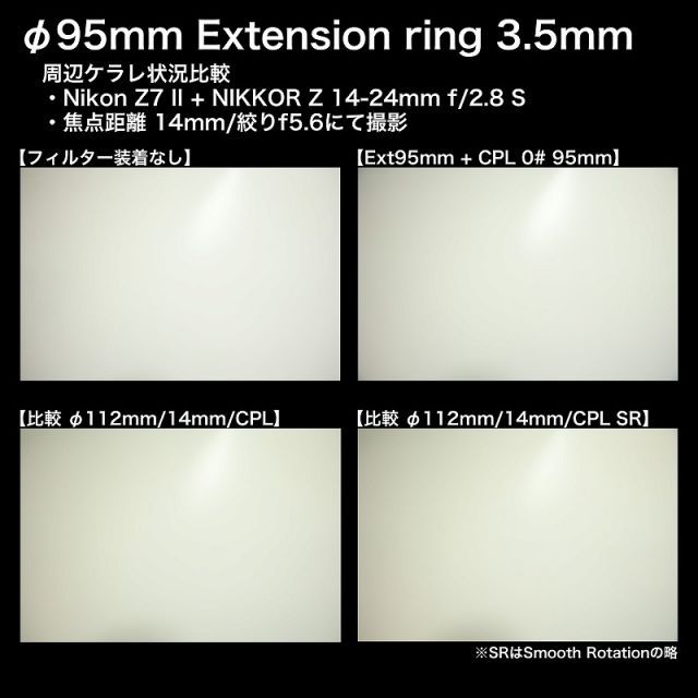 本製品はNikonZ14-24mmf2.8Sに直接フィルター径95mmの丸枠フィルターを取り付けたいというご要望にお応えして企画開発しました。NikkorZ14-24mmf2.8Sレンズにフィルター径95mmのKANIProtector・ND2-64・ND2-400をカブセ式で瞬時に取り付け、ケラレなくご使用になれます。CPLについても、ケラレなく使用することができます。