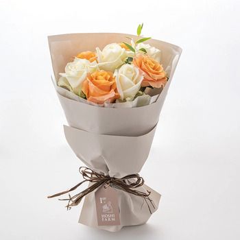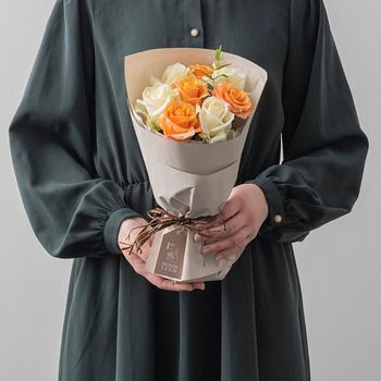 ややピンクがかったオレンジのグラデーションが幻想的なカルピジュームと、淡いグリーンを帯びた白色のアバランチェを組み合わせたブーケは、オレンジとホワイトのコントラストが爽やかな印象です。