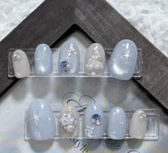 ネイルチップ シマエナガ 手描きアート アイスブルー グレー シルバー
