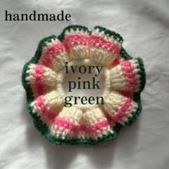 ハンドメイド 編み物 アイボリーとピンクとグリーンのフリルシュシュ
