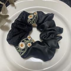 ハンドメイド New!シアー格子×黒レース×カメリア♡ シュシュ