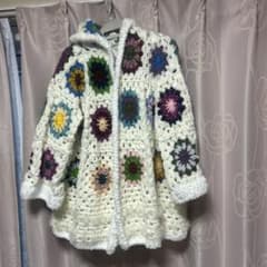 グラニースクエア、Aライン、フード付カーディガンコート。ハンドメイド