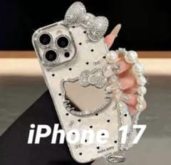iphone 17スマホケース ミラー付きキティ風デコ ストラップ付き シルバー