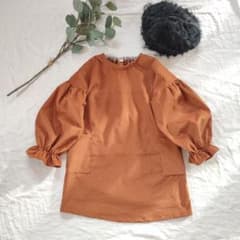 ボリューム袖ワンピースM●コーデュロイドット・ブラウン