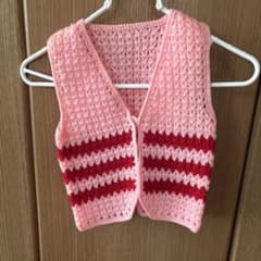 レトロ手編みピンク赤ストライプベスト サイズ80
