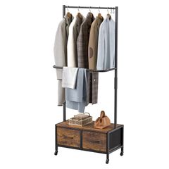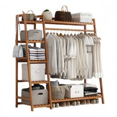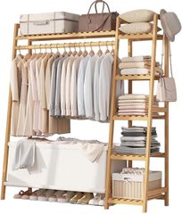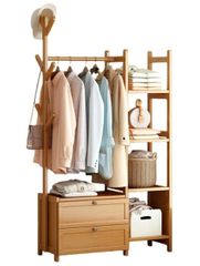 ハンガーラック 木製 ワードローブ 洋服ハンガー コート掛け 物干しスタンド 自立型 多機能 天然竹製 収納ラック 頑丈 大容量 室内 玄関 子供部屋用 省スペース 衣類整理 (110CMB)