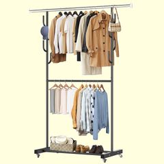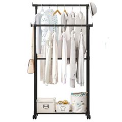 省スペース 総耐荷重 移動楽々 小さめサイズ ちょい掛け用 組み立て簡単 キャスター付き 2段 単身向け ダブル ハンガーラック (ブラック) D.Stomo