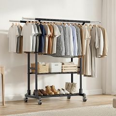 日本語取扱説明書付き 組立簡単 スッキリ収納 収納力あり 衣類収納 おしゃれ 洋服掛け 下棚付き 高さ146-174cm ブラック 幅120-170cm 高さ伸縮 縦横伸縮 ハンガー スチールラック キャスター付き 洋服ラック 大容量 耐荷重380kg 2列2