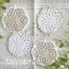 ハンドメイド かぎ編み リフ編み コースター コットンリネン 生成り 4枚Set