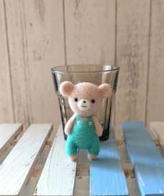 くまさん*羊毛フェルト*ハンドメイド*ブローチ*オーバーオール*うす茶*ブルー