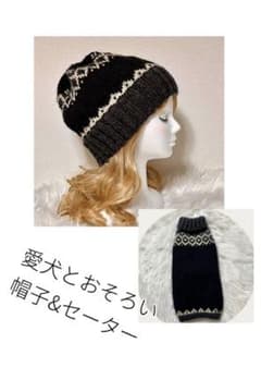 ハンドメイド 愛犬とおそろいセット ウール100 帽子 犬服セーター 黒