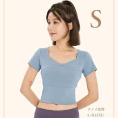 ★ラスト1点★半袖 ブラトップ S ブルー 水色 カップ付き ヨガ フィットネス