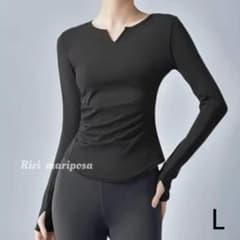 Vカットネック指穴あき長袖トップス黒Lサイズ スポーツ ヨガウェア
