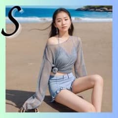 S 韓国風 3点セット水着 水色 体型カバー 長袖トップス ラッシュガード
