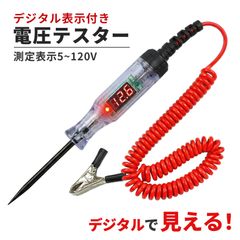 検電テスター デジタル 電圧計 車 バイク 5V-120V 故障診断 通電確認 LED判定 バッテリー チェッカー 配線 整備 工具 DIY メンテナンス 電装品 取り付け アースクリップ コイルケーブル サーキットテスター