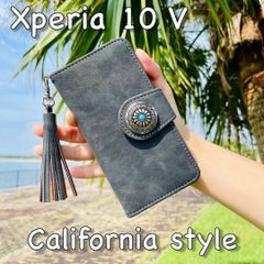 Xperia 10 V スエード調レザーケース コンチョ タッセルストラップ付 手帳型カバー 西海岸カリフォルニアスタイル サーフスタイル ブラック