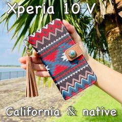 Xperia 10 V レザーケース ネイティブ柄 コンチョ タッセルストラップ付 手帳型カバー 西海岸カリフォルニアスタイル サーフスタイル