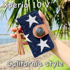 Xperia 10 V レザーケース 星柄 コンチョ タッセルストラップ付 手帳型カバー 西海岸カリフォルニアスタイル サーフスタイル ネイビー