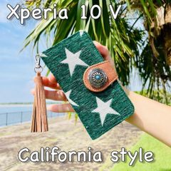 Xperia 10 V レザーケース 星柄 コンチョ タッセルストラップ付 手帳型カバー 西海岸カリフォルニアスタイル サーフスタイル グリーン