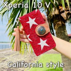 Xperia 10 V レザーケース 星柄 コンチョ タッセルストラップ付 手帳型カバー 西海岸カリフォルニアスタイル サーフスタイル レッド