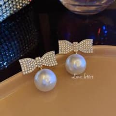 No.359A キラキラゴールドビジューリボンパールピアス 韓国 量産型 地雷