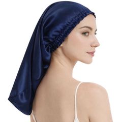 ナイトキャップ ミドルロング ネイビー シルク調 ポリエステル100% 就寝時用 ヘアケア ヘアキャップ 摩擦軽減 丸洗いOK フリーサイズ