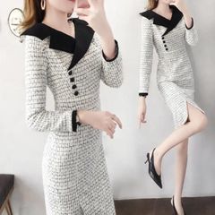ツイードワンピース レディース 長袖 タイトワンピース ママスーツ バイカラー スリット ひざ丈 通勤 フォーマル エレガント 上品 きれいめ 清 春 秋 冬 韓国 成人式 入学式 入園式