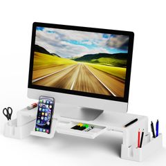 【在庫セール】高さ調節可能 パソコンスタンド/収納引き出し/ペンスロット/携帯電話スタンド 折りたたみ式モニターライザー デスクトップPCやノート モニタースタンドライザー 省スペース Olmaster (収納ホワイト)