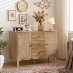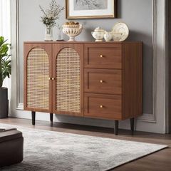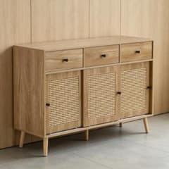 希少新品!キャビネット 木製 サイドボード ラタン調 リビング 収納 扉付き 大容量 3つの引き出し付き 幅120cm 棚 おしゃれ ラタンンキャビネット ルーム ダイニ