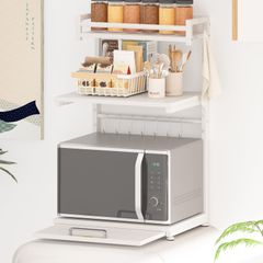 【新着商品】キッチン収納 レンジ上棚 キッチン棚 トースター置き台 台所整理ラック 総耐荷重42.5kg アジャスター・フェルト付き スリム スライド棚・Sフック8個付き 省スペース 棚板高さ4段調節 新生活 幅43奥行き33高さ58~72cm 一人暮らし レ