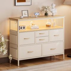 IKIFLY チェスト収納 箪笥 棚付き 寝室収納LEDライト付きリビング収納タンス 引き出し北欧 洋服タンス 布製 整理一人暮らし (ベージュ, 幅100CM)