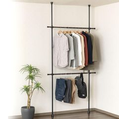 ドウシシャ 省スペースに設置可能な突っ張りハンガーラック 2段式 ブラック 夏服約48着収納可能 縦横伸縮可能 簡単組立 突っ張りラック スリム スチール 伸縮 おしゃれ 全体耐荷重24kg 幅75~120×奥行7.5×高さ200~280cm 黒 省スペース