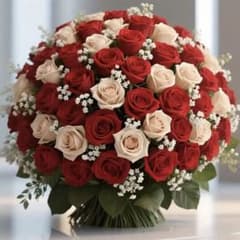 26本 造花ブーケ 赤白ローズ&かすみ草セット 高品質