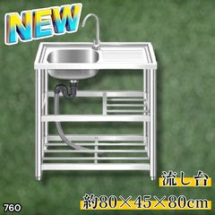 #760 ステンレス製 流し台 作業台付き2段 約幅80x奥行45x高さ80cm 蛇口付き 必要な付属品が全てセット A80 ※北海道、沖縄本島、沖縄の離島、その他離島へは別途配送料有り
