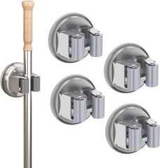 East Leaf モップホルダー 吸盤式 強力固定 壁掛け 掃除道具収納 滑り止め ステンレス製 (シルバー, 4個セット)