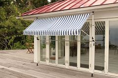 新品 リビングアウト(Living Out) 物干し竿付きオーニング ストライプ 幅303cm×奥行22~145cm×高さ200~300cm 幅3m 日よけ アーム伸縮タイプ 目隠し つっぱり式 UVカット 冷房効率アップ タープ角度調整可能 シェード アジャ