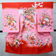 お宮参り 産着 のしめ 女児 女の子 正絹 羽二重 朱色×ピンク 金刺繍 鳳凰 牡丹 祝着 一つ身 掛け着 熨斗目 NO42822-1