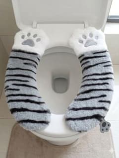 【新品】肉球ハンドル付き!猫の便座シート 左右セット ふわふわ しま猫 グレー