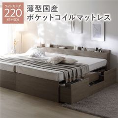 宮付き チェスト ベッド 通常丈ワイドキング 220 S+SD グレージュ 薄型国産ポケットコイルマットレス付 連結 大容量 引き出し キャスター コンセント 棚付き 宮棚付き すのこベッド 収納ベッド チェストベッド ベッドフレーム 連結ベッド 寝具 インテ