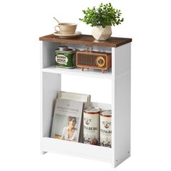 Size:40 x 18 x 56 cm_Color:ホワイト IBUYKE サイドテーブル 狭いナイトスタンド 雑誌テーブル 収納棚 ラック 小さなスペース用 マガジンホルダー付き ミニテーブル コーヒーテーブル リビングサイドテーブル 多機能 木目調 簡易