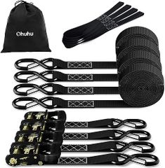 Ohuhu タイダウンベルト ラッシングベルト ラチェットベルト 4.6m 幅38mm 破断荷重1500kg マックス使用荷重 500kg 荷物固定 ベルト ラチェット式 締付固定 引越し 運搬用 多用途 ブラック(4本セット)