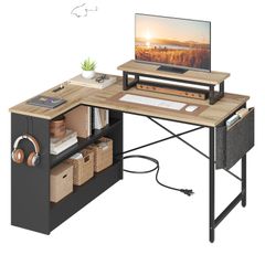 【数量限定】l字デスク コンセント付き パソコンデスク L字 幅107cm 机 PC デスク おしゃれ Bestier 学習机 勉強机 モニター台/LEDライト/収納袋付き コーナーデスク L字型 収納ラック 左右入れ替え可能 木製 ライトオーク