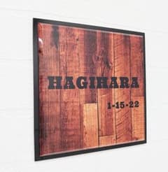 白木目・濃茶木目背景アクリル表札*4辺45度斜めカット鏡面仕上げ*UV印刷