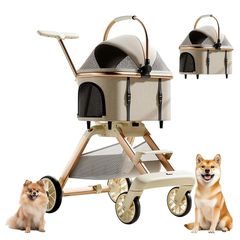Pandaloli ペットカート 犬 バギー ベビーカー:中型犬 小型犬 猫 多頭 カート 4輪 軽量コンパクト 耐荷重25Kg 前輪360°回転 後輪ブレーキ付き 飛び出し防止リード2本付き 折りたたみ 組み立て簡単 ベージュ色 1