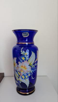 新品 ボヘミアガラス 青色 花柄の花瓶 チェコスロバキア製